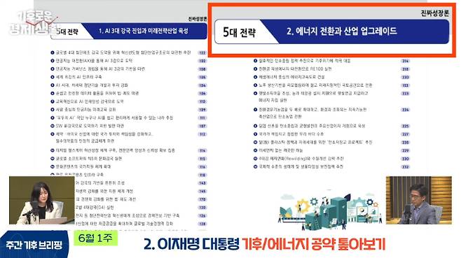 ◇ 최서윤> 우리도 이제 이렇게 가는 것 같아요. '진짜 성장'의 5대 전략을 또 소개했는데 그중 두 번째가 에너지 전환과 산업 업그레이드예요. 산업을 전환해서 경제와 환경에 조화로운 발전을 추진한다고 밝혔습니다. 기후변화에 대응하려면 새롭게 해야 할 정책들이 많잖아요. 이게 신산업이 되고 기업에는 새로운 먹거리랑 투자 분야 넣어주고 노동자들에게는 새로운 일자리를 열어준다는 취지로 보면 될 것 같아요.