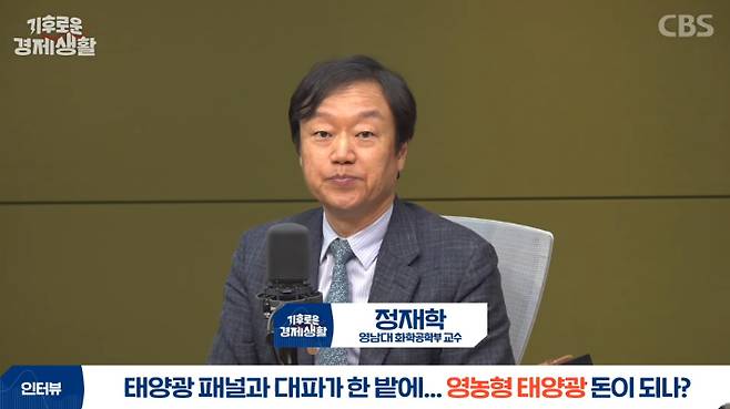 ◆ 홍종호> 농지 위에 태양광 모듈을 설치해서 농업과 태양광 발전을 동시에 할 수 있는 '영농형 태양광'. 식량 주권과 탄소 중립 그리고 농가 소득까지 높일 수 있는 유망한 대안으로 꼽히고 있습니다. 이번 대선에서 이재명 대통령도 영농형 태양광을 집중적으로 육성하겠다는 공약을 내놓았는데요. 다짐만으론 되지 않는 정책, 현실적으로 필요한 건 뭔지 알아보겠습니다. 현장과 연구실을 오가며 영농형 태양광을 연구하시는 분입니다. 정재학 영남대 화학공학부 교수와 얘기 나눠보겠습니다. 안녕하세요.
