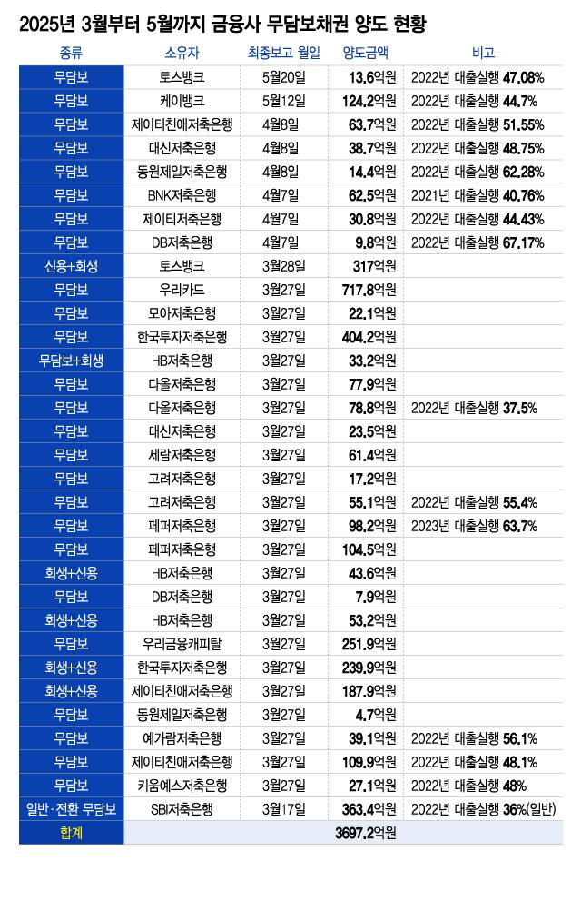 8일 머니투데이가 집계한 최근 3개월(3월 1일~5월 31일) 금융사들의 자산유동화 양도등록 현황에 따르면 무담보 NPL은 총 3697억2000만원어치(33건) 양도거래됐다.