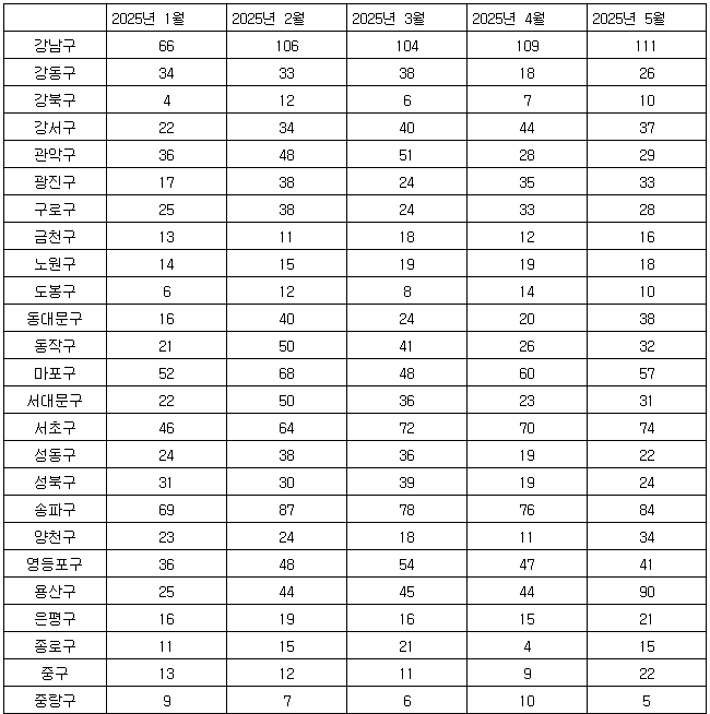 강남구의 경우 2020년에는 87명에 불과했으나 2021년 197명으로 증가한 데 이어 2022년 443명, 2023년 501명, 지난해에는 945명까지 늘었다.
