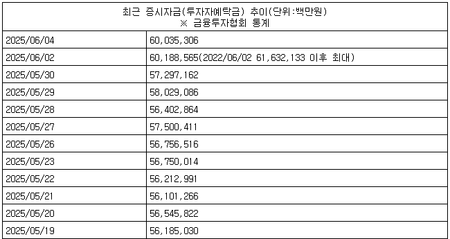 실제로 대표적 증시 자금인 투자자예탁금은 지난 2일 기준 60조1천886억원까지 불었다.