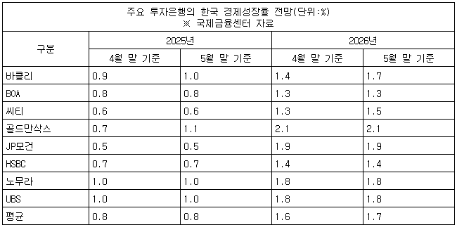 이밖에 모건스탠리도 지난달 22일 보고서를 통해 한국의 올해 성장률 전망치를 1.0%에서 1.1%로, 내년 전망치를 1.4%에서 1.5%로 각각 높였다.