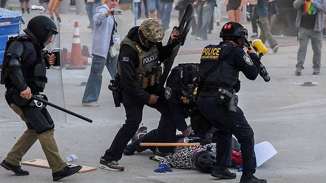 미국 이민 세관 단속국의 강압적인 단속에 LA 시내에 수백 명이 모여 시위를 벌이다 연방 요원들과 충돌해 최루탄이 터지고 부상자가 발생하는 등 반발이 거세지고 있습니다.