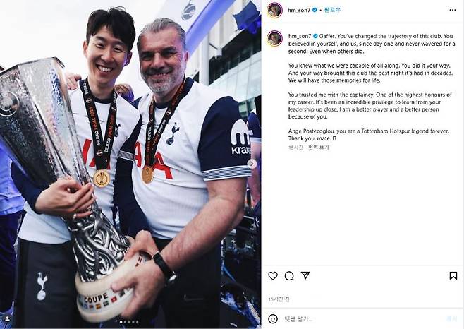 마지막으로 손흥민은 "안지 포스테코글루, 당신은 토트넘 홋스퍼의 전설로 영원히 기억될 것"이라며 "고맙다, 친구여"라고 덧붙였다.