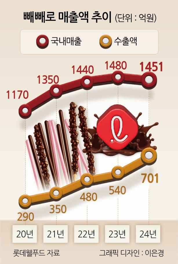 1983년 출시된 빼빼로는 지난해 국내외에서 2152억원의 매출을 올렸다. 누적 매출은 2조원에 육박한다. 대표 제품인 초코빼빼로로 환산하면 판매량은 약 35억갑에 달한다. 우리 국민이 1인당 67갑씩 먹은 양이다. 전 세계 인구(약 82억명)로 환산하면 40%가 초코빼빼로를 먹은 셈이다.