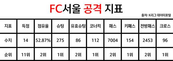 7경기 무패 중에도 3경기 0득점을 비롯해 ‘득점력 부족’에 대한 우려는 계속해서 서울의 꼬리표로 따라다녔고, ‘해결사’ 역할을 해줘야 할 조영욱은 첫 골은 기록했으나 슈팅 수와 기대득점(xG) 등 공격 면에서 아쉬움이 많았다.
