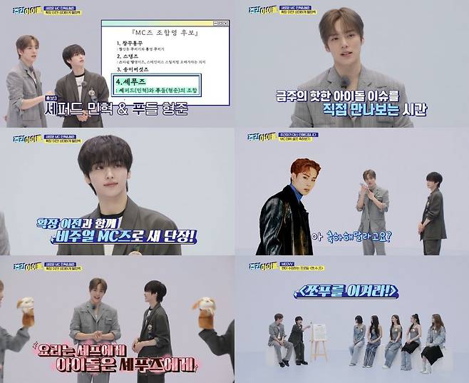 이어 민혁과 형준은 두 사람의 MC 조합명을 직접 선택했다. 시청자들의 설문을 통해 제안된 후보 중 ‘셰푸즈(셰퍼드 민혁+푸들 형준)’라는 조합명이 최종 선택됐고, 민혁은 ”요리는 셰프에게, 아이돌은 셰푸즈에게!“라는 멘트를 덧붙이며 넘치는 센스를 자랑했다.