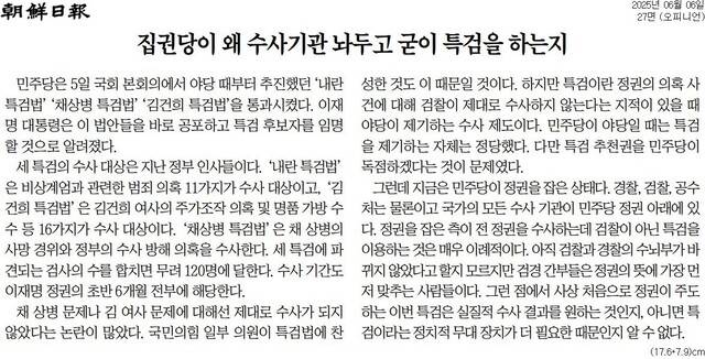 세가지 특검법에 대한 언론의 평가는 “불가피하다”는 쪽입니다. 조선일보만 달랐습니다. 6일치 신문에 “집권당이 왜 수사기관 놔두고 굳이 특검을 하는지”라는 제목의 사설을 썼습니다. 주진우 의원의 궤변과 같은 주장입니다.