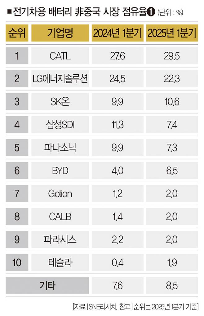 [※참고: 중국을 제외한 시장에서 10위권 내 한국 기업과 중국 기업의 시장 점유율 합계는 2024년까지만 해도 각각 43.6%와 35.0%로 한국 기업이 앞섰다. 하지만 올해 1분기 시장 점유율 합계는 한국 기업이 40.3%, 중국 기업이 42.0%다. 따라서 올해 국내 배터리 3사는 시장 점유율 합계 경쟁에서도 중국에 밀릴 가능성이 높아 보인다.]