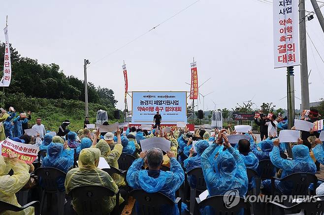 (제주=연합뉴스) 변지철 기자 = 8일 폐기물처리시설인 제주환경자원순환센터가 위치한 제주시 구좌읍 동복리에서 지역 주민들이 '농경지 폐열지원사업 약속이행 촉구 결의대회'를 열고 지원사업 약속 이행을 제주도에 요구하며 센터 진입로를 이틀째 봉쇄하고 있다. 2025.6.8