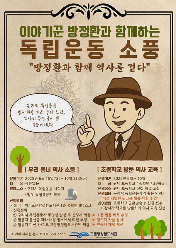 내용은 ▶'이야기꾼 방정환'이 들려주는 구리시 독립운동사 영상 감상 ▶구리시 독립운동 사적지 및 망우 독립유공자 묘역 탐방 ▶초등학교 방문 역사 교육 등이다.