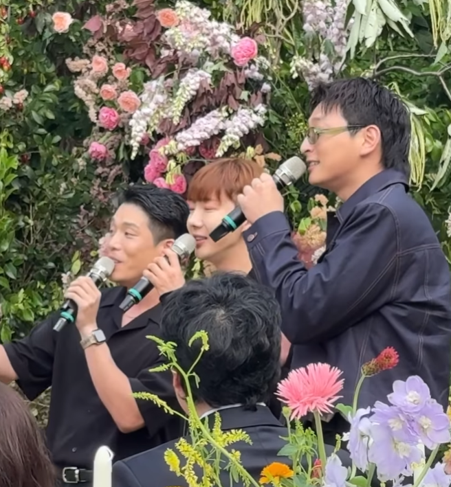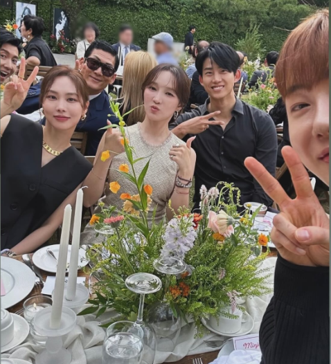 또한 사진 속에는 에프엑스 멤버 엠버, 플라이 투 더 스카이 브라이언, 김재중, 방송인 홍석천 등의 모습도 찾아볼 수 있다. 특히 조권은 2AM 멤버 이창민, 정진운과 축가를 부른데 이어 부케까지 받으며 눈길을 끌었다.