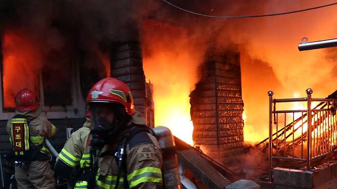 ▲ 7일 오후 부산 동래구 한 2층짜리 주택 1층에서 불길이 치솟고 있다. 이 화재로 70대 집주인이 2도 화상을 입었다.