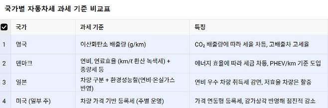 주요 선진국들은 자동차세가 단순한 ‘보유세’가 아니라, 환경정책과 조화를 이루는 도구로 작동해야 한다는 공감대를 바탕으로 과세 체계를 전환 중이다.