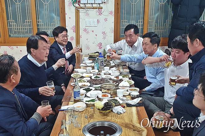 | ▲ 국민의힘 윤석열 대선후보, 이준석 대표, 김기현 원내대표 등이 2021년 12월 3일 울산 울주군의 한 식당에서 만찬 회동(소위 울산회동)을 하며 술을 마시고 있다. 박성민 의원이 김기현 원내대표 옆(왼쪽)에 앉아있다. |