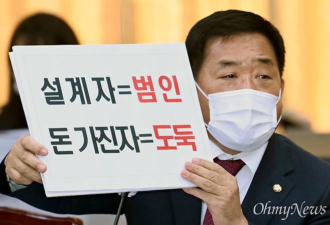 | ▲ 2021년 10월 20일 박성민 국민의힘 의원이 경기도청에서 열린 국회 국토교통위원회의 경기도청에 대한 국정감사에서 질의 도중 피켓을 들어보이고 있다. 당시 경기도지사 자격으로 국감에 출석한 이재명 대선후보에게 박 의원은 “(대장동 의혹과 관련해 사업을)설계한 사람이 범인”이라고 주장했다. 이 후보는 “범죄를 설계한 사람은 범인이 맞다. 그런데 비행기를 설계했다고 9·11 테러 주범이 될 수 없다”고 반박했다. 이 후보는 "(도둑질 한 사람이) 국민의힘이다. 나는 도둑질을 못하게 막은 사람"이라고 말했다. |