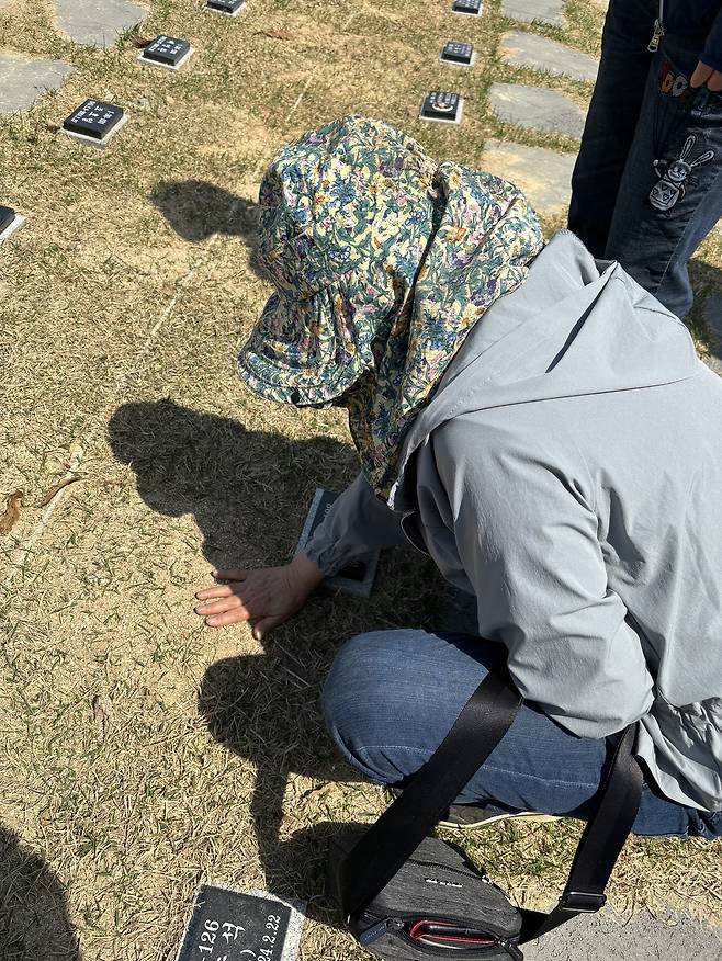 | ▲ 아빠가 잠드신 잔디장 위를 쓰다듬는 엄마 엄마 집과 아빠 잔디장 묘가 가까워서 다행이다 |