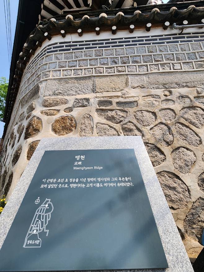 | ▲ 북촌 언덕에 맹현(孟峴)이라는 표지석도 있다. “이 근방은 조선 초 정승을 지낸 청백리 맹사성과 그의 후손들이 모여 살았던 곳으로, 맹현이라는 고개 이름도 여기에서 유래했다”고 적혀 있다. (2025년 5월 촬영) |