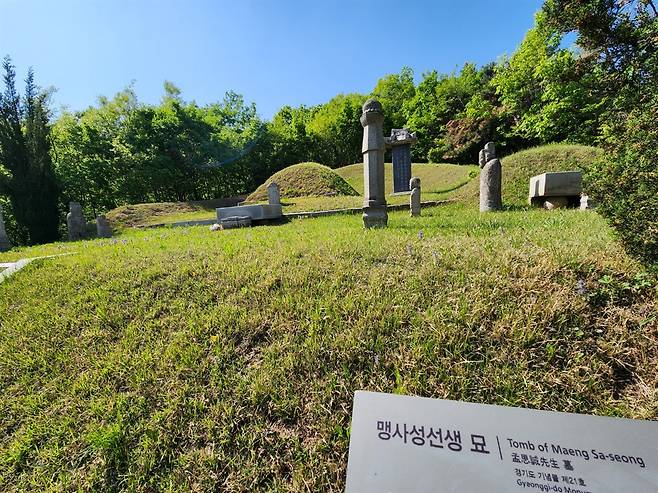 | ▲ 조선 청백리의 상징인 고불 맹사성의 묘는 경기도 광주시 영장산 자락(일명 맹산)에 있다. 부인과는 별도로 묘를 썼다. 근처에 부인 철원 최씨 묘가 있다. 영장산 산행을 하면서 여러 차례 다녀갔다. (2025년 4월 촬영) |