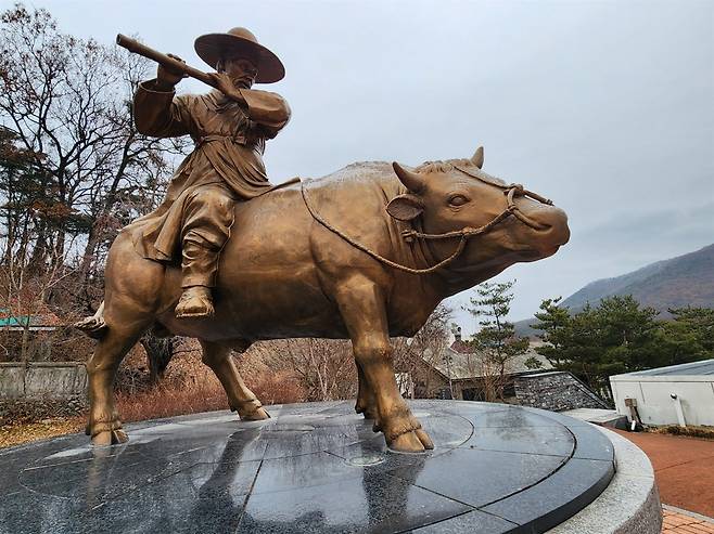 | ▲ 충남 아산시 배방읍 고불맹사성기념관 외부에 만들어진 ‘소를 탄 맹사성' 동상. 맹사성은 평소 소를 타고 피리를 불며 서울과 온양을 오갔다고 한다. 맹사성은 음률에도 밝았는데, 그가 쓰던 옥적(피리)도 남아 있다. (2025년 3월 촬영) |