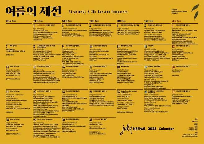 공연기획사 더하우스콘서트가 매년 여름 선보이는 '줄라이 페스티벌'이 올해는 '스트라빈스키와 20세기 러시아 작곡가'를 주제로 오는 7월1~31일 대학로 예술가의집에서 열린다.