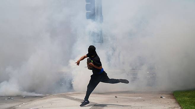 ▲ 7일(현지시간) LA 파라마운트 지역에서 이민 단속 반대 시위대가 진압대가 쏜 최루탄 가스를 피해 돌을 던지고 있다.