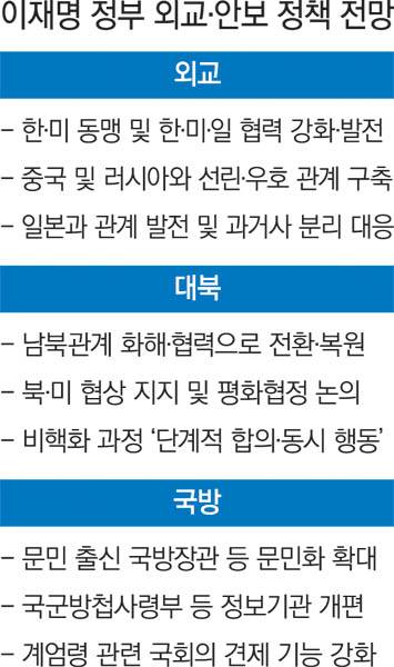 이재명 정부는 외교·안보 정책에서 윤석열 정부의 기조를 뒤집고 변화를 줄 것으로 전망된다. 한·미동맹을 중심에 놓으면서도 중국 및 러시아와의 관계도 원만하게 끌고 가는 유연한 자세를 추구할 것으로 보인다. 지난 정부가 ‘힘을 통한 평화’ 기치 아래 대북 강경책에 집중한 것과 달리 이재명 정부는 대화·협력에 방점을 둘 것으로 점쳐진다. 북·미 대화 재개를 지원하는 등 북핵 문제 해결에도 역량을 쏟을 것이란 관측도 나온다. 다만 달리진 국제정세로 정부의 구상이 어느 정도 실효성이 있을지는 예단하기 어렵다.