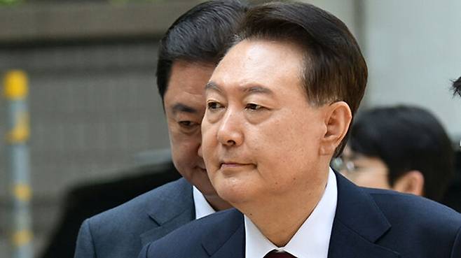 ▲ 윤석열 전 대통령이 12일 서울 서초구 중앙지방법원에서 열린 내란 우두머리 혐의, 직권남용 권리행사방해 혐의 사건 3차 공판에 출석하고 있다.