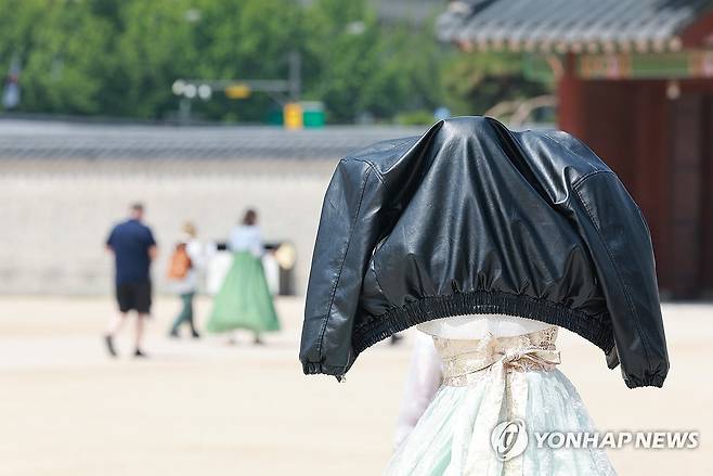 (서울=연합뉴스) 신현우 기자 = 8일 서울 경복궁을 찾은 관광객이 겉옷으로 햇볕을 막고 있다. 2025.6.8