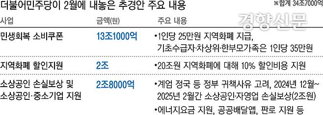이 대통령의 대선공약인 소상공인 빚 탕감 정책도 이번 추경에 포함될 것으로 보인다. 민주당의 지난 2월 추경안에는 소상공인·중소기업 지원 금액 2조8000억원이 포함됐다. 민주당은 12·3 계엄 정국과 무안공항 폐쇄 등 정부 귀책 사유를 고려해 지난해 12월부터 지난 2월까지 소상공인·자영업자의 손실을 보상해주자고 제안했다.