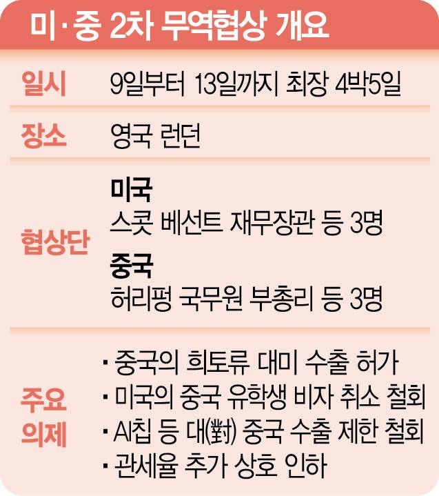8일(이하 현지 시간) 블룸버그통신 등 주요 외신에 따르면 미국과 중국의 무역 협상단은 9일 영국 런던에서 두 번째 협상을 갖는다. 중국 측은 허리펑 부총리와 리청강 상무부 국제무역담판대표, 랴오민 재정부 부부장이 협상에 나선다. 미국 측은 스콧 베선트 재무장관과 제이미슨 그리어 무역대표부(USTR) 대표와 함께 하워드 러트닉 상무장관이 합류하면서 3대3 구조가 됐다. 미국 측은 중국의 희토류 수출제한을 핵심 의제로 들고 나올 것으로 보인다. 중국 측은 회담을 앞두고 일단 한발 물러선 모양새다. 중국 상무부 대변인은 “수요와 우려를 고려해 희토류 관련 품목 수출 허가 신청을 심사했으며 일부 신청은 승인했다”고 밝혔다.