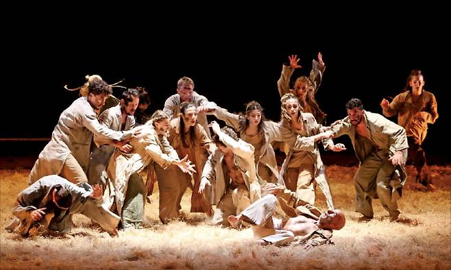 무대 위에 짚 더미가 수북했다. 이곳에서 아무리 발버둥쳐도 결국은 다 부질없다는 얘길까. 무용수들의 생명력 넘치는 춤사위와 함께 지푸라기가 시종일관 흩날렸다. 지난 5일 부산 영화의전당 하늘연극장 무대에 헝가리 세게드현대발레단의 ‘카르미나 부라나’(사진)가 올랐다. 부산국제무용제 개막 초청작으로 공연된 이 작품은 운명은 인간이 예측할 수 없으며 감히 맞설 수 없는 존재라는 메시지를 70분에 걸쳐 전달했다.