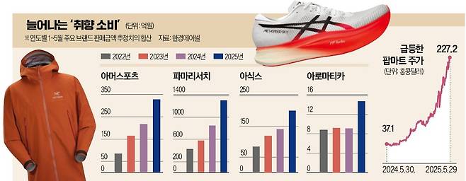 8일 대체 데이터 플랫폼 한경에이셀(Aicel)에 따르면 팝마트, 아식스, 파마리서치, 아머스포츠, 아로마티카 등의 제품 판매가 올해 들어 가파른 성장세를 보이고 있다. 굴지의 유명 브랜드는 아니지만, 가격이 저렴하지 않아 구매 결정에 개인 취향이 크게 작용하는 제품 및 브랜드를 앞세웠다는 공통점이 있다.