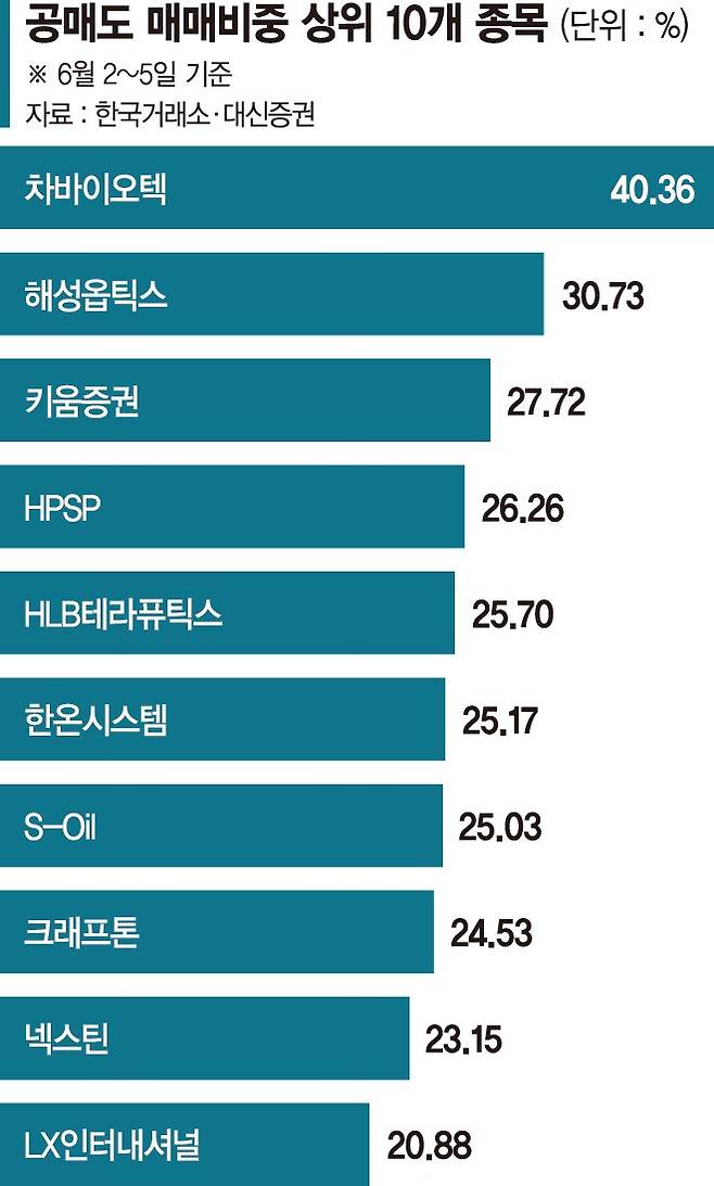 8일 한국거래소와 대신증권에 따르면 지난 2일부터 5일까지 차바이오텍의 경우 주식 거래량에서 차지하는 공매도 물량 비중(매매비중)이 40.3%에 달했다.