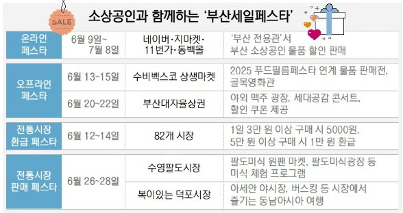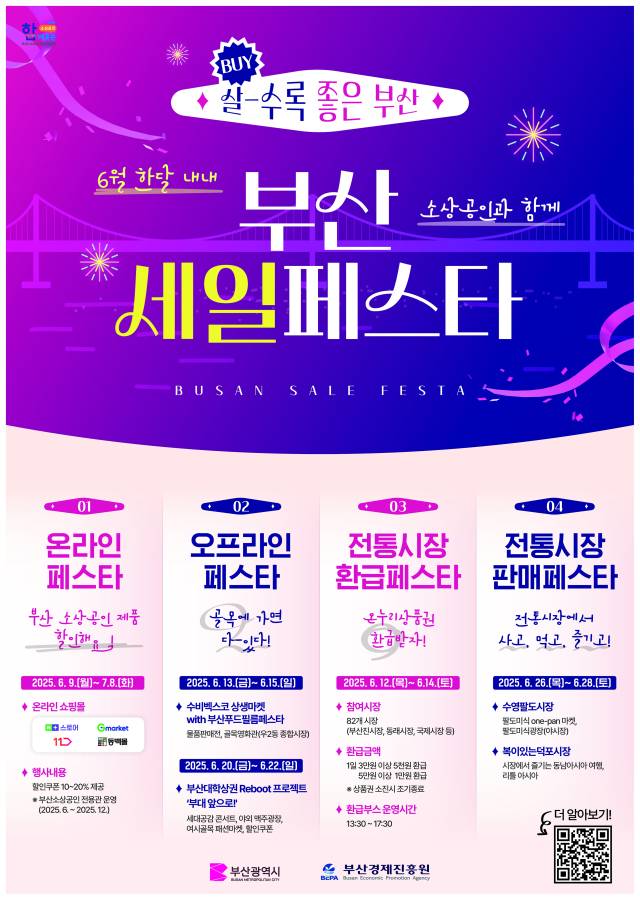 박형준 시장은 “6월 한 달간 시민 모두가 즐기면서 지역 경제에도 도움이 되는 다양한 행사를 마련했다”며 “부산세일페스타가 지역 상권과 전통시장에 새로운 활력을 불어넣는 계기가 되길 바란다”고 밝혔다.