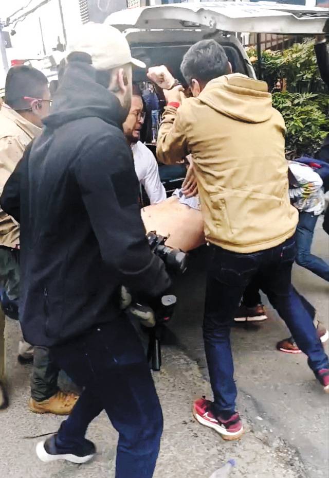 콜롬비아 보수 야당 대권 주자인 미겔 우리베 투르바이(위쪽 사진) 상원의원이 7일(현지시간) 수도 보고타의 한 공원에서 연설 중 총격을 받고 병원으로 이송되고 있다.