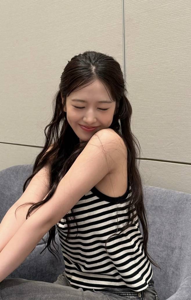 공개된 사진 속 안유진은 블랙 앤 화이트 스트라이프 슬리브리스 상의로 트렌디한 감각을 뽐냈다.