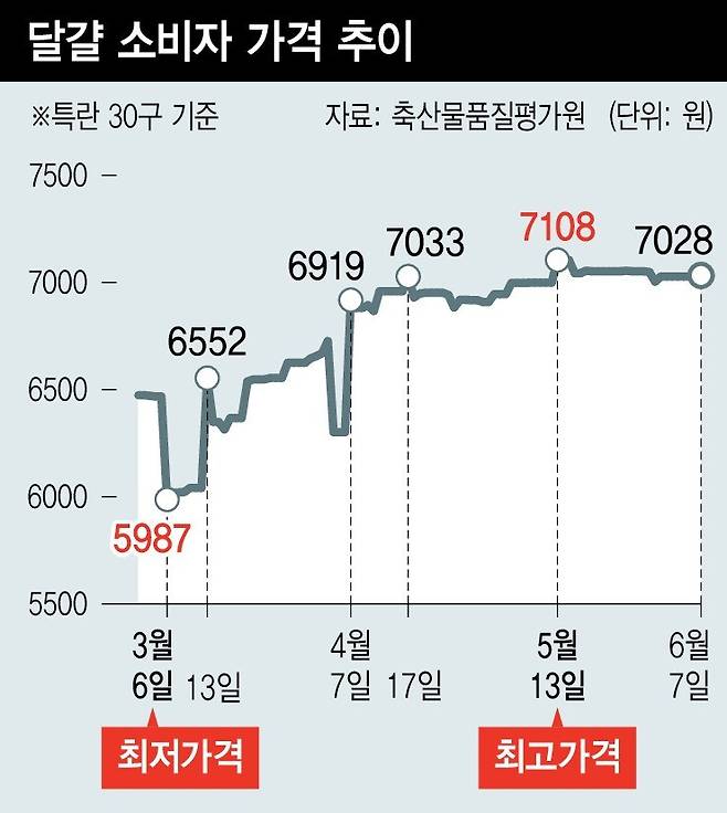 달걀 산지 가격 급등은 최근 들어 나타난 현상이다. 지난 3월만 해도 특란 10개 가격은 1년 전보다 2.3% 오르는 데 그쳤지만, 4월과 지난달에는 각각 10.2%, 12.2% 급등했다.