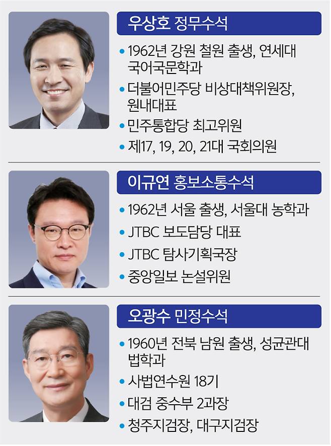 우상호 정무수석 민주당 주요보직 거친 86세대 아이콘 이규연 홍보소통수석 탐사보도 전문으로 해온 언론인 출신 오광수 민정수석 李와 연수원 동기… 이재용 변호 이력