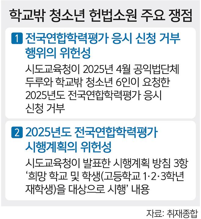 전국의 고등학교 3학년 학생들이 학평을 치른 이튿날인 5일, ‘학교 밖 청소년’ 4명이 서울 종로구 헌법재판소를 찾았다. 이들은 공익인권법단체 ‘두루’와 함께 “학교를 다니지 않는 청소년에게도 학평 응시자격을 부여해 달라”며 헌법소원을 냈다. 각 시도 교육청이 주관하는 학평은 재학생에 한해 응시 기회가 주어지는 탓이다. 검정고시 출신 대통령까지 나왔지만, 사회에서 학교 밖 청소년은 여전히 제도권 밖에 있다.