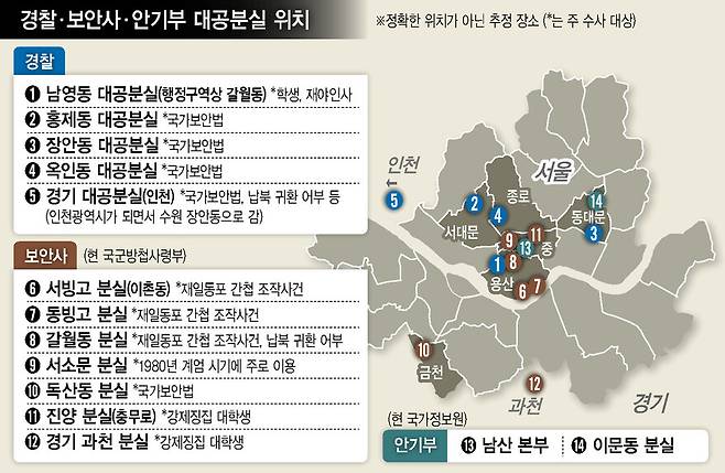 수사관들은 정체를 알 수 없었다. 김씨는 온갖 고문을 당하고 나올 때까지 고문 가해자가 안기부·보안사·경찰 중 어디 소속인지 끝내 알지 못했다. 반면 전씨는 “안기부(현 국가정보원)였다”고 했다. 수사관이 자신을 풀어줄 때 “어려운 일 있으면 연락하라”며 명함을 줬는데 거기 ‘안기부’라고 적혀 있었다는 것이다. 하지만 이는 정보기관의 속성상 오히려 혼선을 주려는 속임수였을지 모른다. 그렇다면 그날 이들은 어디로 끌려갔던 것일까.