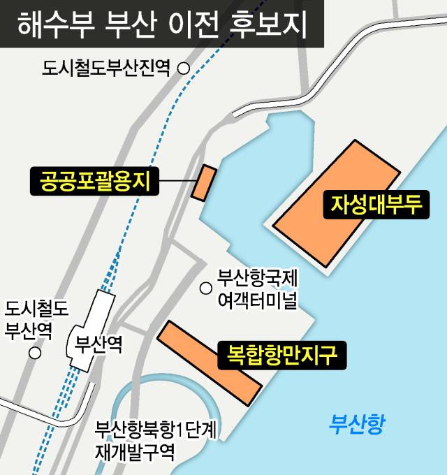 그 중 북항 1단계 재개발 지역의 복합항만지구 내 해양 관련 기관 클러스터(약 7만 7000㎡) 부지가 가장 현실성 있는 대안으로 꼽힌다. 해당 부지는 BPA 소유지만 곧 정산을 통해 해수부로 이관 예정이다. 또한 개발 계획상 클러스터에는 해양 관련 기관이 입주하는 것으로 돼 있어, 해수부 이전 명분과도 맞다. 현재는 한국해양진흥공사와 한국해운조합부산지부가 클러스터 이전을 위한 업무협약을 체결한 상황이다.