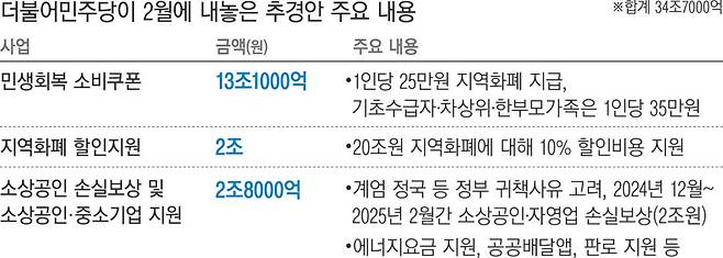 이 대통령의 대선 공약인 소상공인 빚 탕감 정책도 이번 추경에 포함될 것으로 보인다. 민주당의 지난 2월 추경안에는 소상공인·중소기업 지원금액 2조8000억원이 포함됐다. 민주당은 12·3 계엄 정국과 무안공항 폐쇄 등 정부 귀책사유를 고려해 지난해 12월부터 지난 2월까지 소상공인·자영업자의 손실을 보상해주자고 제안했다.