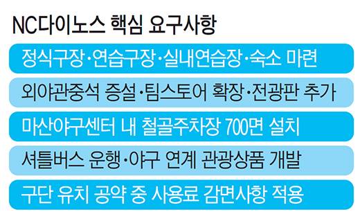 NC다이노스의 요구사항은 △정식구장 1개면, 연습구장 2개면, 실내연습장, 선수단 숙소 마련 △외야 관중석 증설, 팀스토어 확장, 전광판 추가 설치 △대중교통노선 확대 △셔틀버스 운행 △마산야구센터 내 추가 철골주차장 700면 설치 △마산야구센터 인근 신규 주차장 신설 △도시철도 계획대로 추진 △철도노선 확대 및 시간 연장 △야구연계 관광상품 개발 △광고계약을 통해 시의 구단 유치 공약 중 사용료 감면사항 적용 △연간티켓 구입 지원 △사고 이후 NC파크 사용불가로 인한 손실 지원 △비시즌 NC파크 내 프로그램 활성화 등이다.