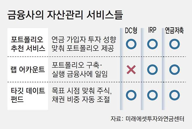 투자 경험도, 역량도, 시간도 많지 않은 근로자에게 자산배분은 쉽지 않은 일이다. 고액자산가는 금융사의 자산관리 매니저의 도움을 받을 수 있지만, 평범한 퇴직연금 가입자가 이런 기회를 갖기는 쉽지 않다. 이에 일부 금융사들은 이 같은 문제를 해결하기 위해 연금 가입자들에게 ‘포트폴리오 추천 서비스’를 제공하고 있다.