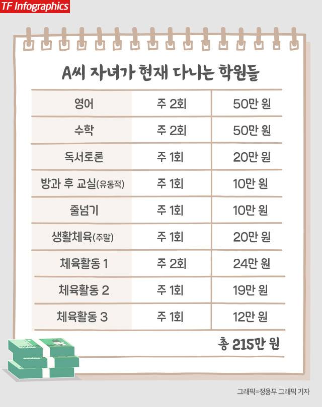 소득, 자산 면에서 고소득층(5분위·월 소득 1119만9000원·자산 12억3780만 원)인 A씨 부부는 아이 학원비로만 한 달에 210만원 정도 지출한다. 웬만한 사회초년생 월급, 우리나라 교육급여 기준이 되는 중위소득 50%인 251만2676원(3인 기준)의 80%를 넘는 금액이다. 그마저도 "같은 영어유치원 출신 아이들은 국어 2개, 영어 3개, 수학 2개가 보통인데 우리 아이는 좀 덜 보내고 체육 활동을 많이 시키는 편"이라고 했다.