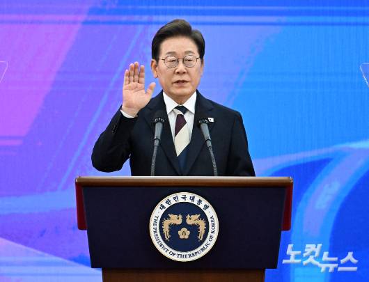 이재명 대통령은 이날 오전 11시쯤 국회에서 취임선서를 갖고 제21대 대통령 임기를 시작했다. 이 대통령은 "민생회복과 경제 살리기부터 시작하겠다"며 "불황과 일전을 치른다는 각오로 비상경제대응TF를 곧바로 지금 즉시 가동하겠다"고 밝혔다. 이 대통령은 "국민이 맡긴 총칼로 국민주권을 빼앗는 내란은, 이제 다시는 재발해선 안 된다"며 "철저한 진상규명으로 그에 합당한 책임을 묻고, 재발방지책을 확고히 세우겠다"고 덧붙였다. 이날 취임식에선 군악·의장대 행진 및 예포 발사, 축하공연 등 주요 의식 모두 생략됐다. 이후 이 대통령은 원내 정당 대표들과 만나 오찬을 가지며 "자주 대화하면 좋겠다"고 말했다. 사진=연합뉴스