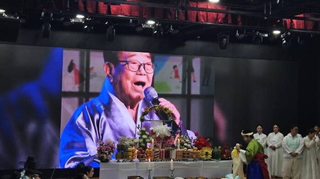 무대에는 꽃과 과일, 떡으로 가득 채운 제사상이 차려졌고 고인이 마이크를 잡고 있는 사진이 걸렸습니다.