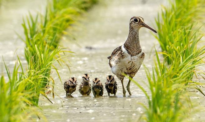 지난달 20일 호사도요 둥지에서 새끼 4마리가 깨어나 어미를 따라 다른 논으로 이동하는 장면이 관찰됐다. 호사도요가 울산에서 관찰된 것은 이번이 처음이다.