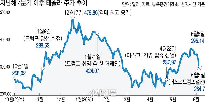 특히 테슬라의 경우 이번 갈등을 계기로 크게 타격을 받을 수 있다는 전망이 초대형 악재로 작용했다. 테슬라는 트럼프 정부에서 자율주행 규제 완화 등 테슬라에 우호적인 정책을 펼칠 것이란 기대감에 힘입어 트럼프 당선 이후부터 두달 반 동안 90% 폭등하며 지난해 12월 역대 최고 종가(479.86달러)를 기록했다. 그러나 트럼프 정부와의 마찰로 이 같은 효과를 기대하기 어려워졌다.